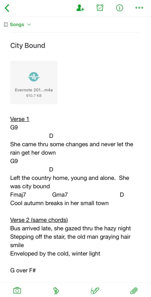 As I mentioned, I record these sketches with my phone using a note-taking application called Evernote. Evernote gives me the ability to just capture things quickly while also synchronizing across all my devices. I can record the audio right with the written lyric ideas and work on both things whenever an idea strikes. The image below is a screenshot of “Bound” in Evernote after the first few weeks. Notice the audio recording at the top and the words and guitar chords underneath that.